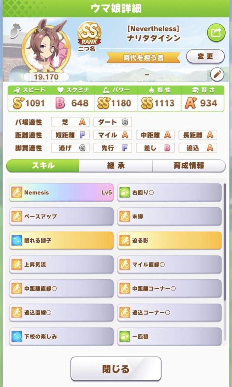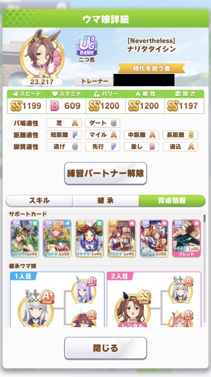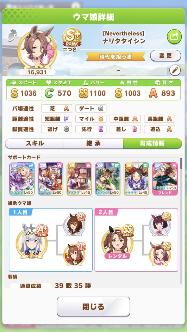 スピ1200距離S付いたら他ステ少々欠けてても完成って自分に言い聞かせられるんだ🙄